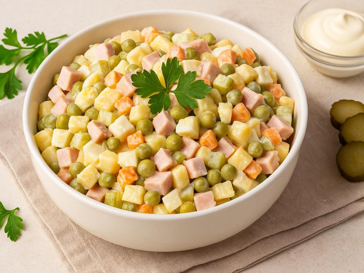 Советский салат Оливье давно стал не просто праздничным блюдом, а символом домашнего уюта, объединяющим поколения за одним столом. Его состав никогда не был закреплён официальным документом, поэтому рецепт менялся от семьи к семье, сохраняя при этом узнаваемую основу. Споры о правильном наборе ингредиентов не утихают до сих пор, что лишь подчёркивает уникальность и живучесть этого кулинарного феномена. История появления и народная эволюция Классический советский вариант Оливье возник не по строгому рецепту, а как адаптация под доступные продукты. В отличие от дореволюционного оригинала, где использовались редкие деликатесы, советская версия вобрала в себя простые и понятные ингредиенты. Отсутствие жёсткого стандарта привело к тому, что салат постепенно стал народным, а каждая хозяйка добавляла в него что-то своё. Основу блюда составляли варёные овощи, яйца, колбаса или мясо, зелёный горошек и маринованные огурцы. Эти продукты были доступны большую часть года, что делало салат универсальным. Одни считали обязательным компонентом морковь, другие наоборот предпочитали обходиться без неё. Споры велись и вокруг лука: он придавал салату резкость, которую одни ценили, а другим она казалась лишней.